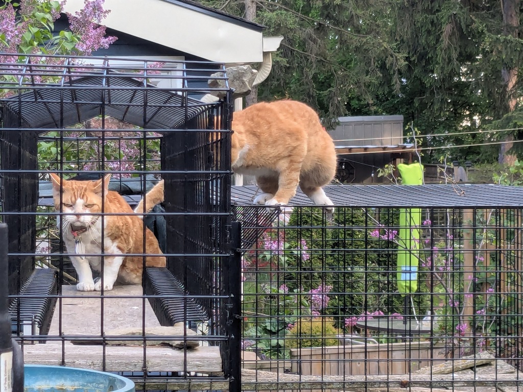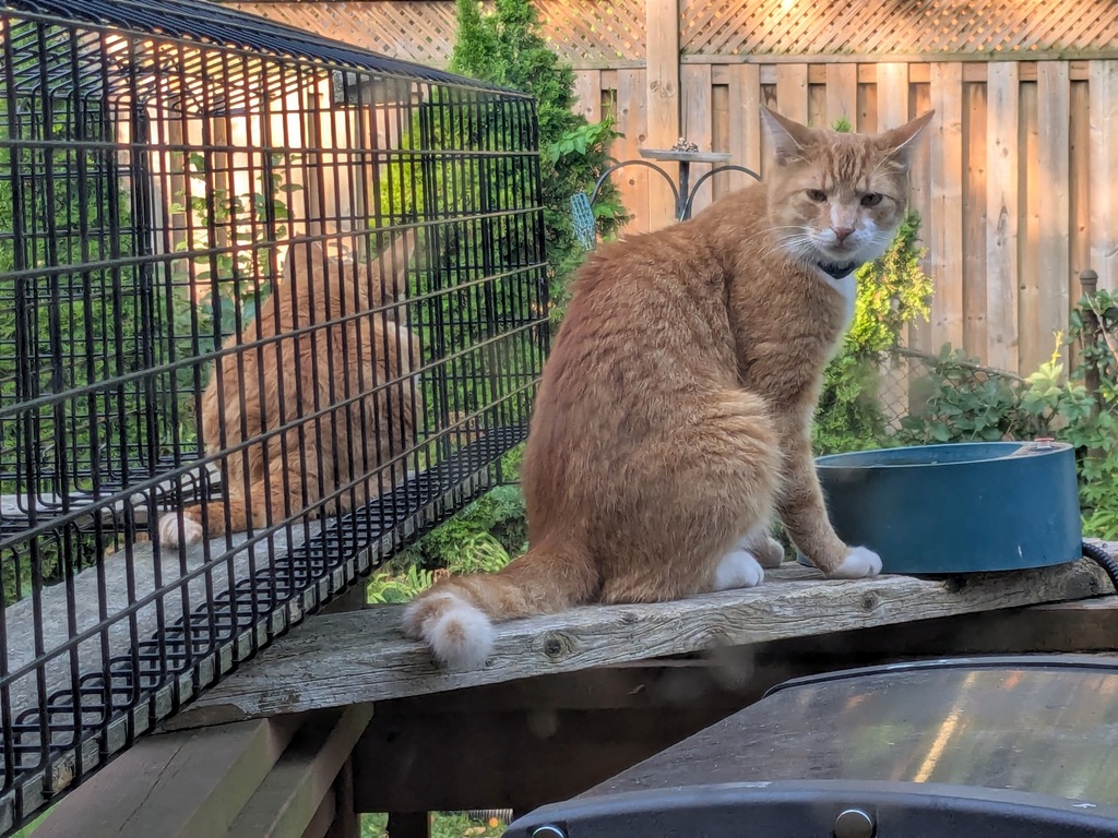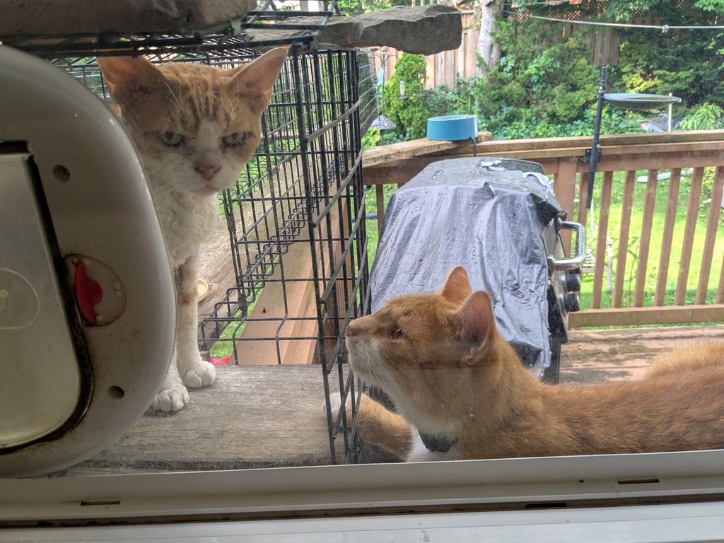 The neighbour’s cat Harry is so in love with Frodo and desperate to play, but Frodo, who is normally so friendly, just wants to understand why he is in a cage while Harry is not (and why Harry is twice his size but only half as handsome ;0)!