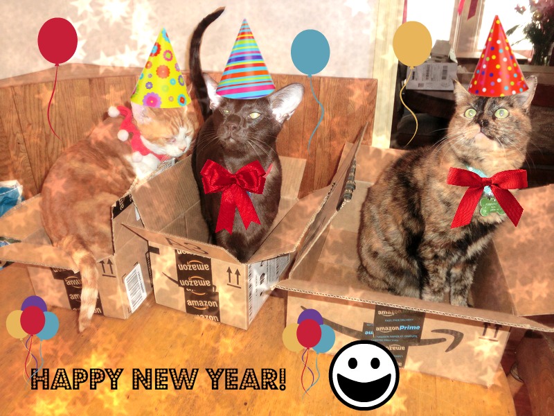 It’s hard to get a photo of all three of the felines together so we are using the one from yesterday of the gang enjoying their boxes. We added a few festive touches. Happy New Year!