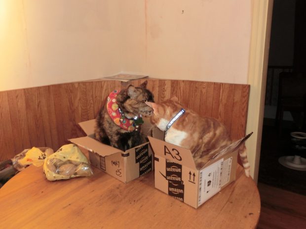 As you may recall, we have photographic evidence that Amarula (ostensibly driven mad by snow and too much mulled wine, according to her) kissed Frodo (or maybe it was just the magic of the Amazon boxes?!).