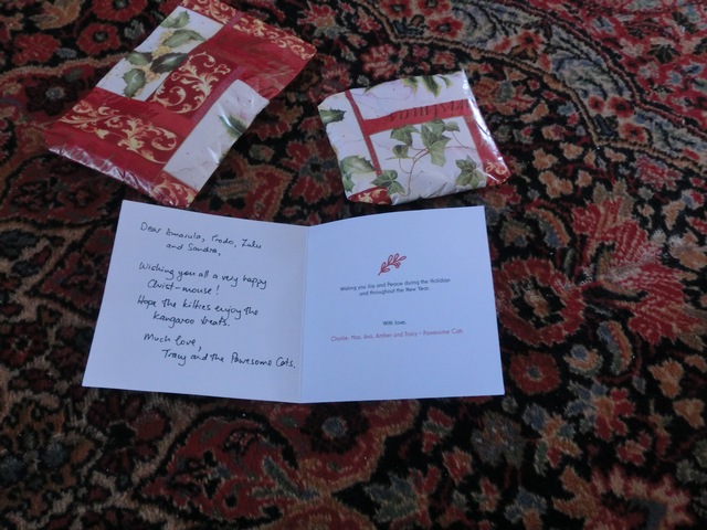 AMARULA: Well I will admit the gifts were beautifully wrapped and came with a lovely card (again, shamefully addressed to Zulu and Frodo as well as myself. I mean really…I don’t even think those two can even read!) It says “Wishing you a happy Christ-mouse from the Pawesome Cats Charlie, Max, Ava, Amber and Mom Tracy!”