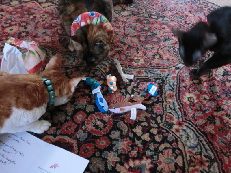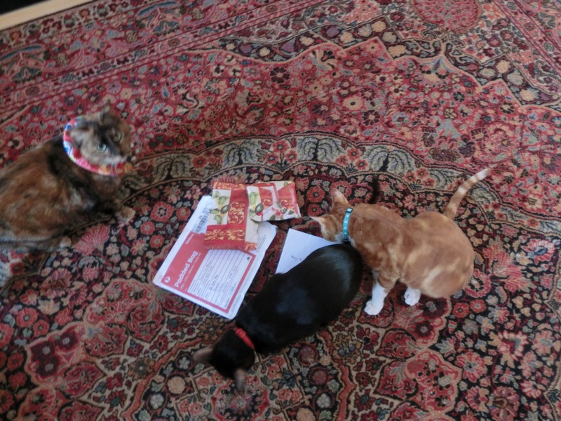 We participated in Secret Paws for the first time this year and unfortunately (through no fault of our wonderful Secret Paws gift-giver Pawesome Cats— the gifts were coming all the way from Australia! It says on the package they were mailed end of Nov on one part of the package and the other says…get this…Sept 9, 2015…I think the Australian postal service might need some help…either that or they have the ability to go back in time!!) they arrived just a teensy, weensy, itsy bit late. But the wait was worth it! See for yourself…Yeah Christmas in March!