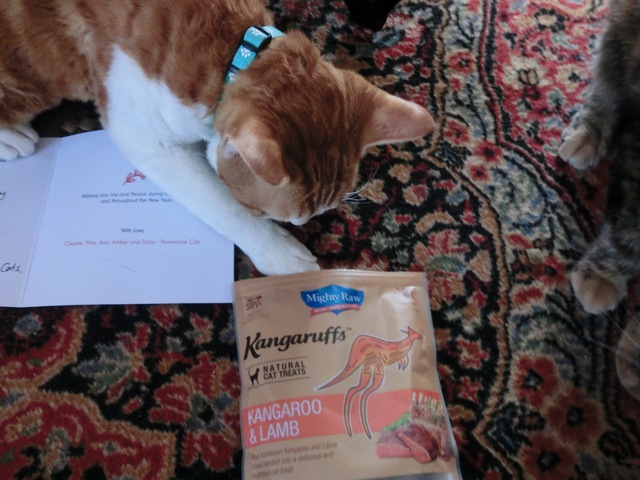 6. What a pawsum package. Christmas is good any time of da year. We’d like it ifin it was every month. We’ve never had kangaroo, but those sure look yummy. We told mommy to check ’round and see ifin she can find us any. Big hugs