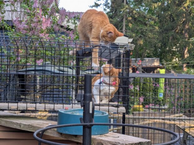 The neighbour’s cat Harry is so in love with Frodo and desperate to play, but Frodo, who is normally so friendly, just wants to understand why he is in a cage while Harry is not (and why Harry is twice his size but only half as handsome ;0)!