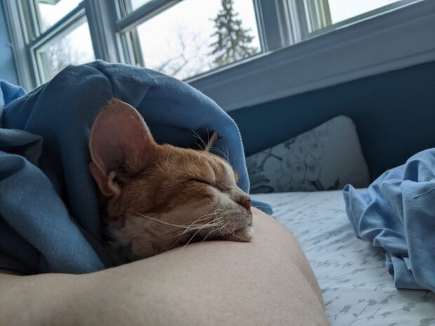 Aww, Frodo is adorable curled up with you. I love waking up with a kitty near me.