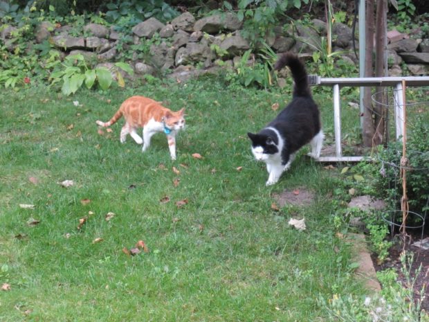 Oh Frodo, you are such a friendly guy and so very welcoming – didn’t you see the new kitty mark all over YOUR territory ? Amarula must have been hammering at the windows to get out and tell him who was boss. And you just offer him head bumps and want snuggles!