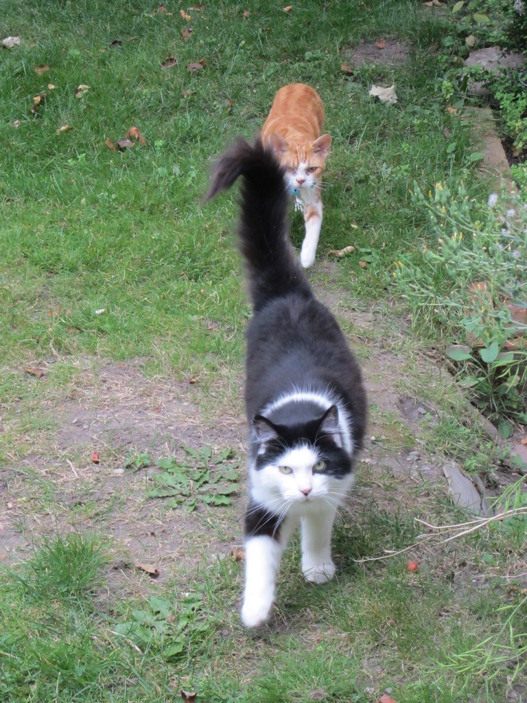 Oh Frodo, you are such a friendly guy and so very welcoming – didn’t you see the new kitty mark all over YOUR territory ? Amarula must have been hammering at the windows to get out and tell him who was boss. And you just offer him head bumps and want snuggles!