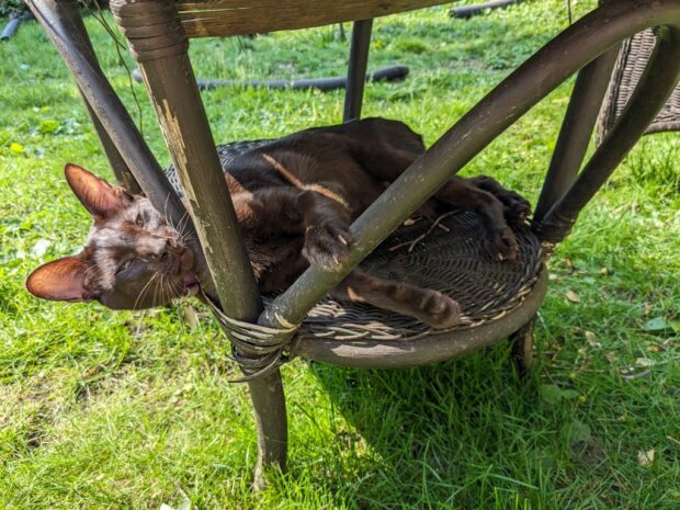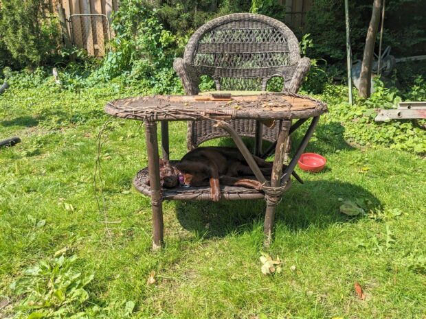 It gives him shade but he can pop his head out when he wants more sun. So should I tell him about the impending demise of his table or just let him enjoy his last summer with it?