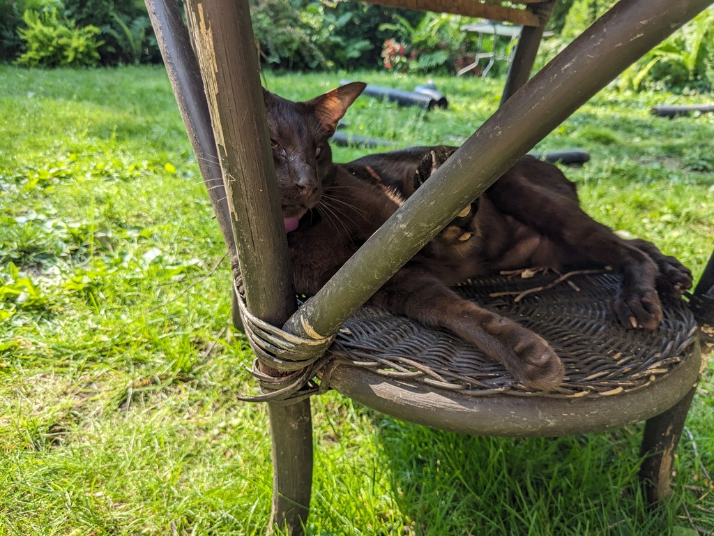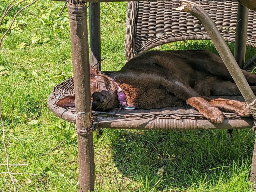 It gives him shade but he can pop his head out when he wants more sun. So should I tell him about the impending demise of his table or just let him enjoy his last summer with it?