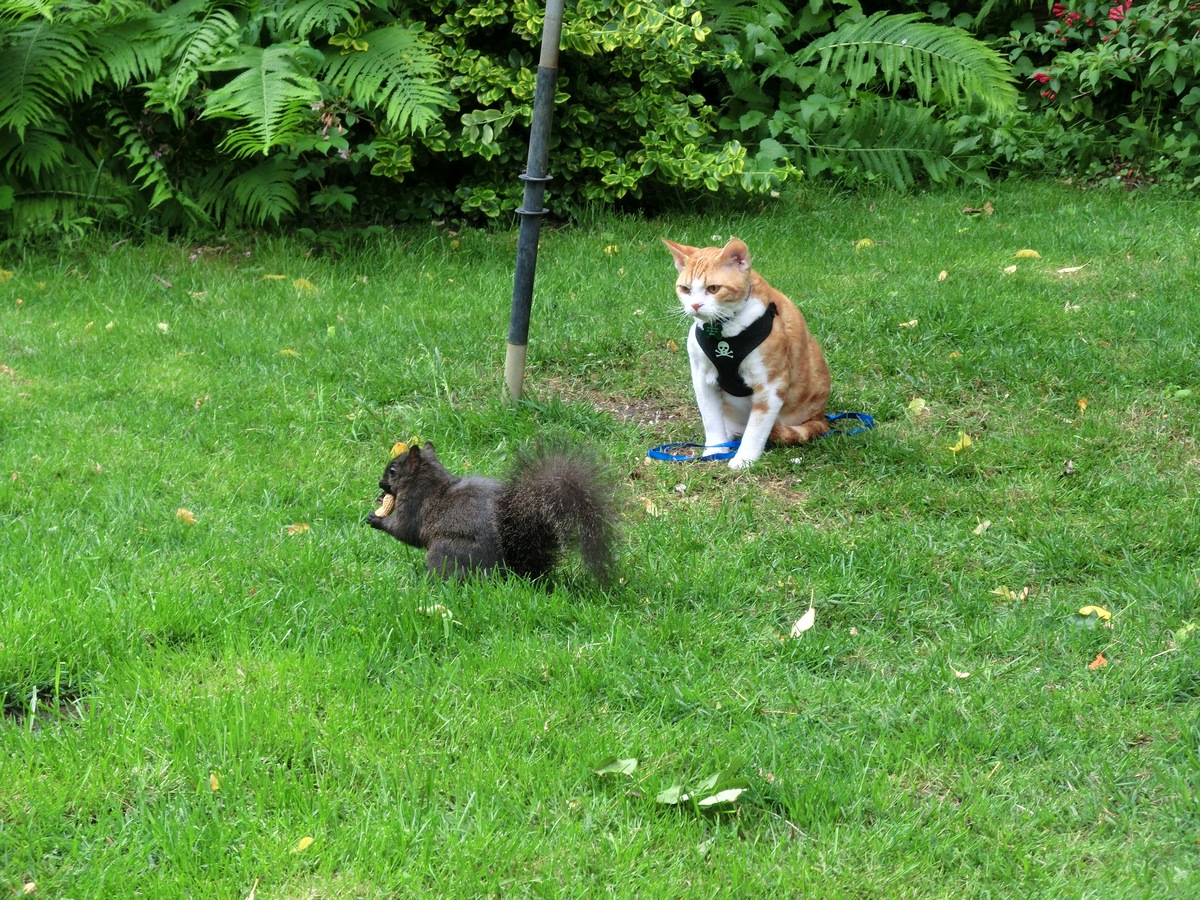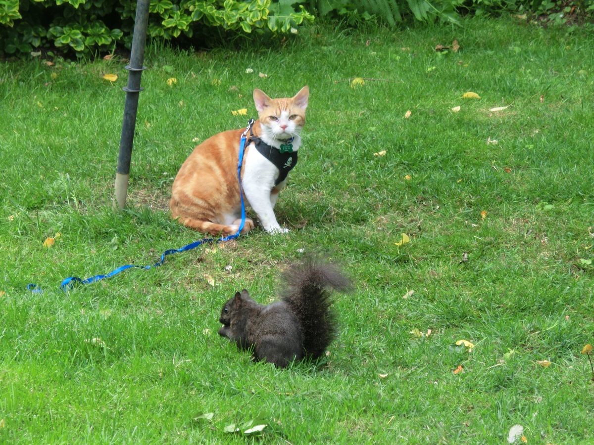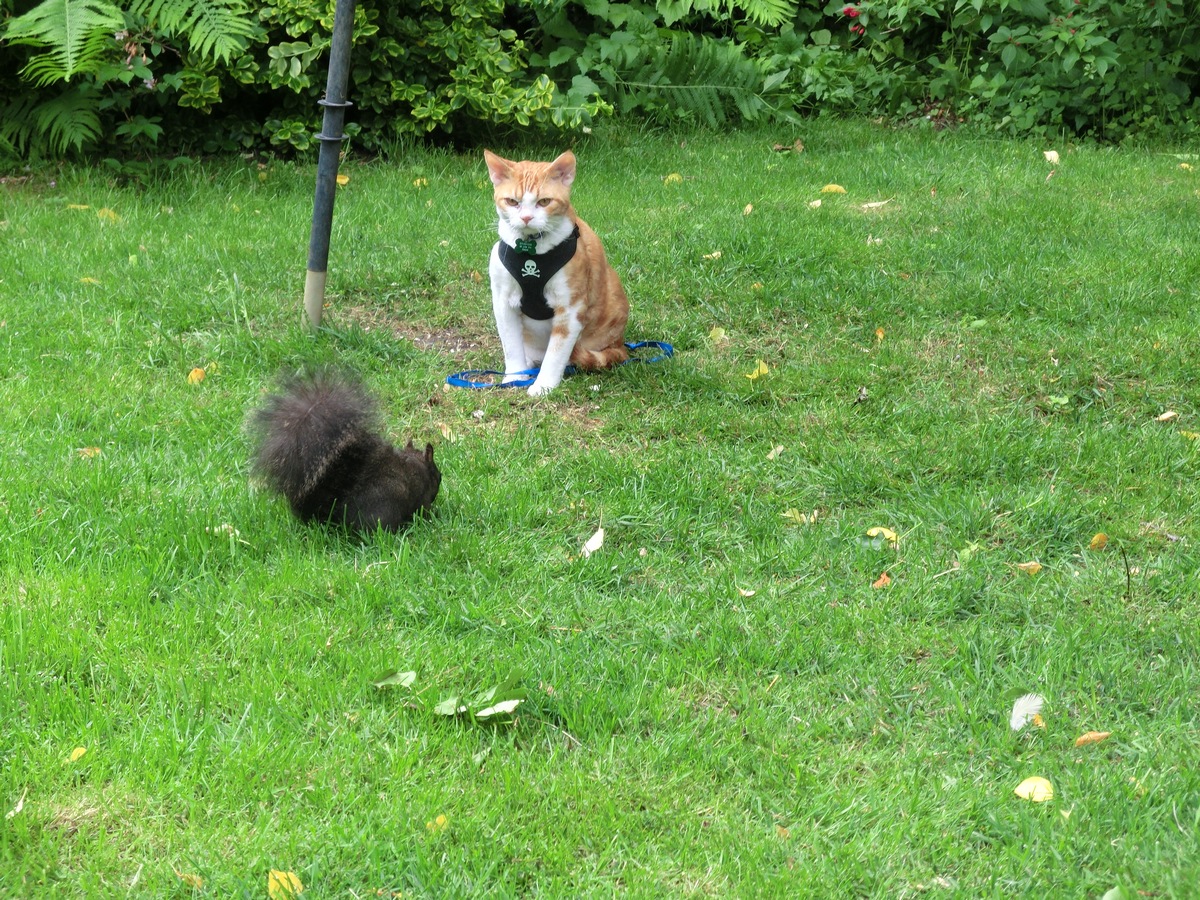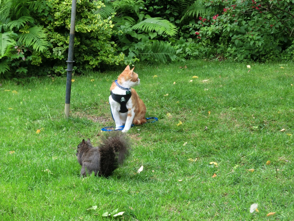 Though it sure has a strange tail for a cat! So big and fluffy! And I can’t figure out why mom is not making it wear a harness like me and Zulu have to!