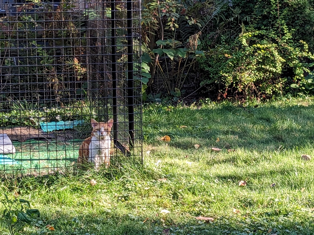 NO! That orange and white kitty you see is not Frodo. It’s Harry! One of my neighbours got a young cat named Harry. Incredibly friendly. He keeps coming to my backyard to try to make friends with the cats.