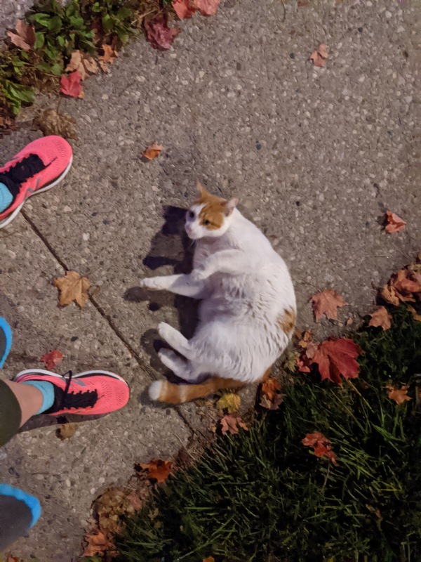 You may remember that a few months back I did a post on all the wonderful kitties I meet in my neighbourhood while on my runs. As winter is approaching (and feline run-ins will get much more rare–cats don’t seem to like to be out much during Canadian winters) I thought I would share a whole NEW (seriously-these are all new cats-that is just how many friendly felines are in my neighborhood that I get the pleasure to meet on my runs) series of kitties I have met on my latest runs (and check out my cool new pink runners at the end!)