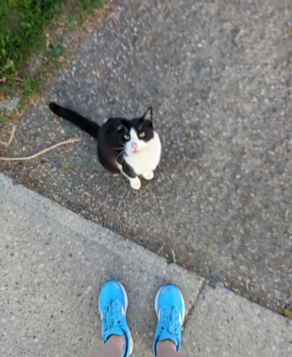 What adorable cats you got to meet on your run. Our mom walks almost every day and never sees any cats outside. Sometimes there might be one in a window but that’s it.