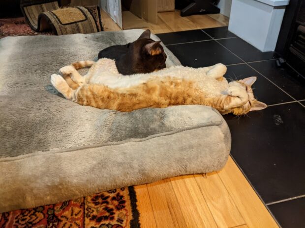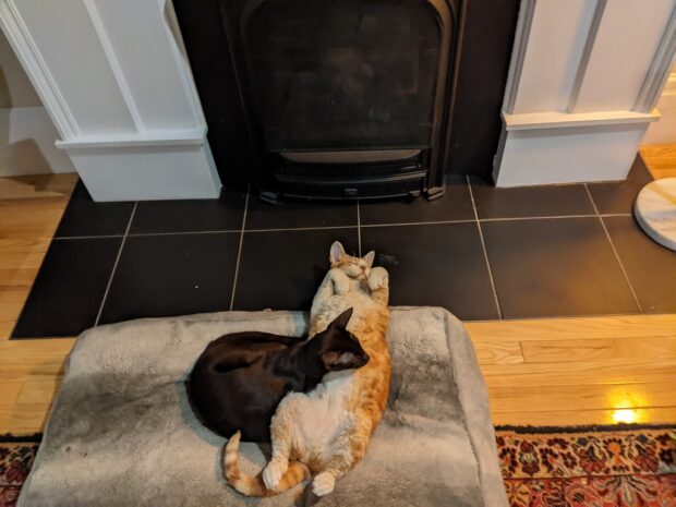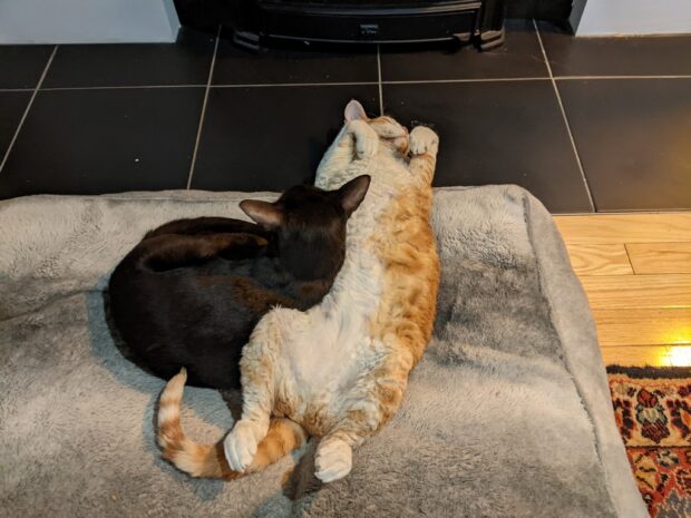 They look so cosy, fire or no! Lovely that they snuggle up together.