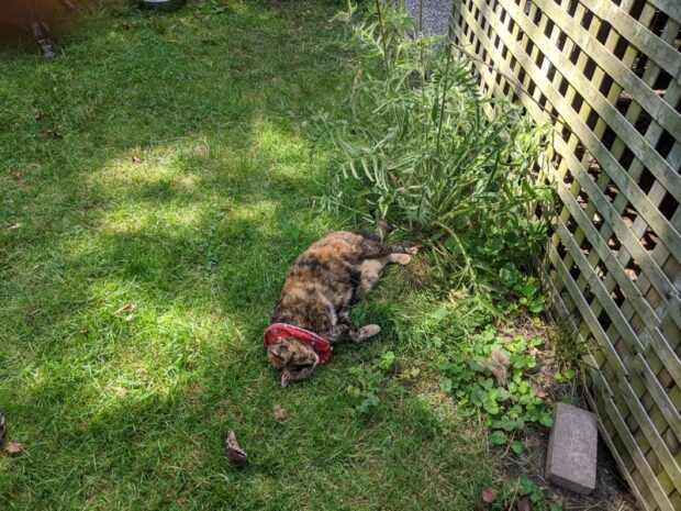 The sun tends to wipe Amarula out and she naps frequently in the middle of the yard.