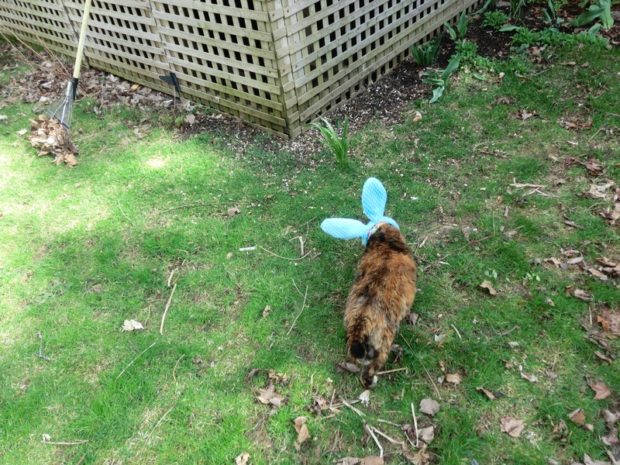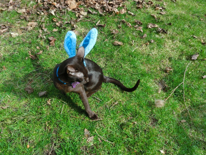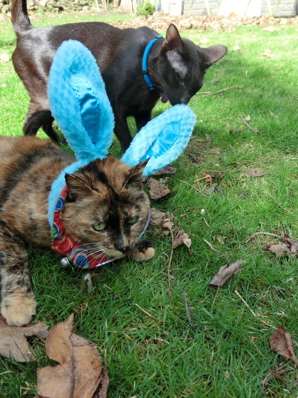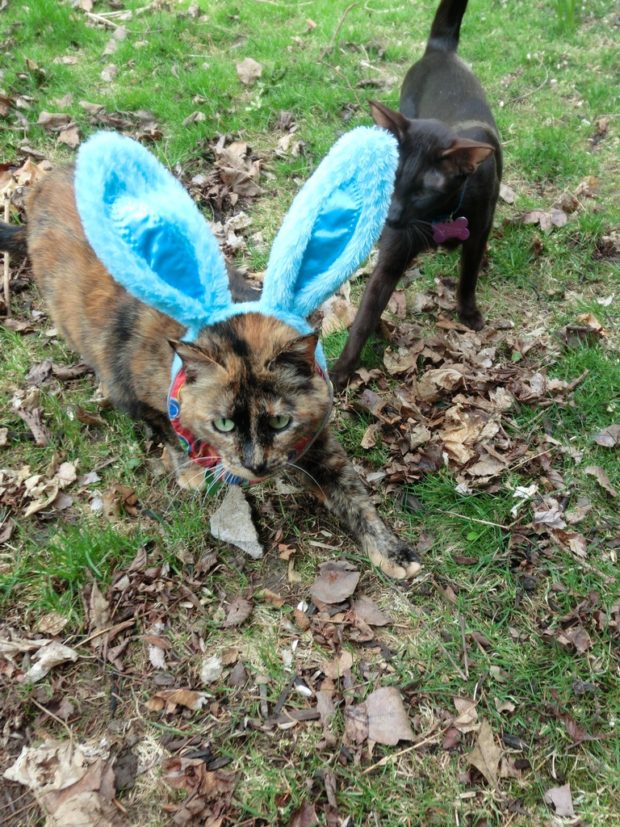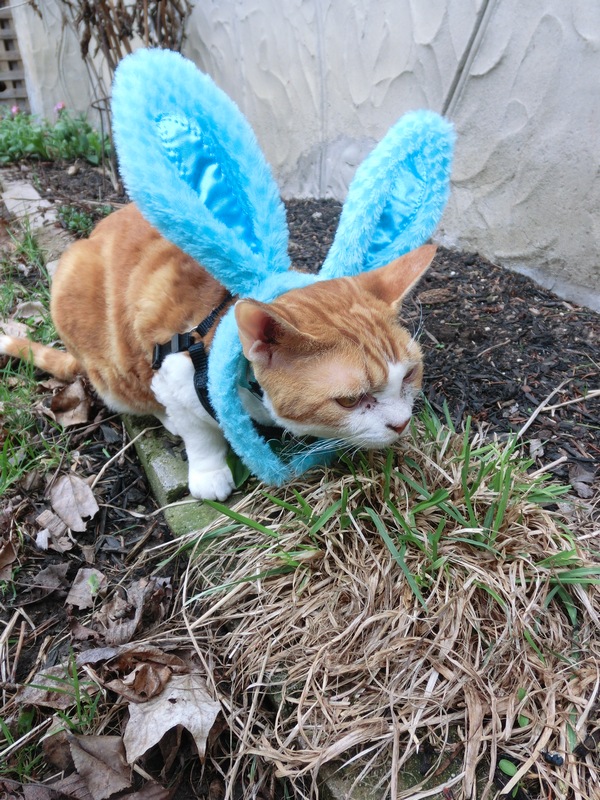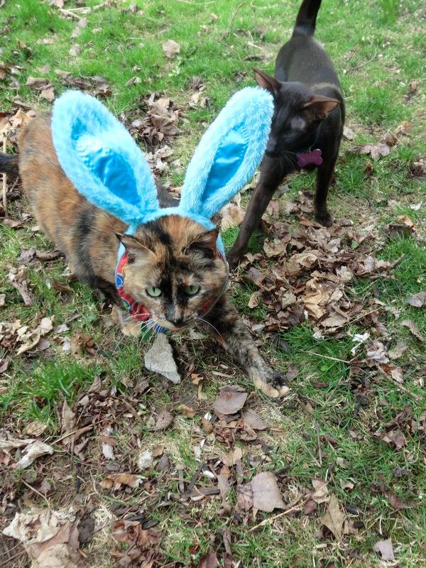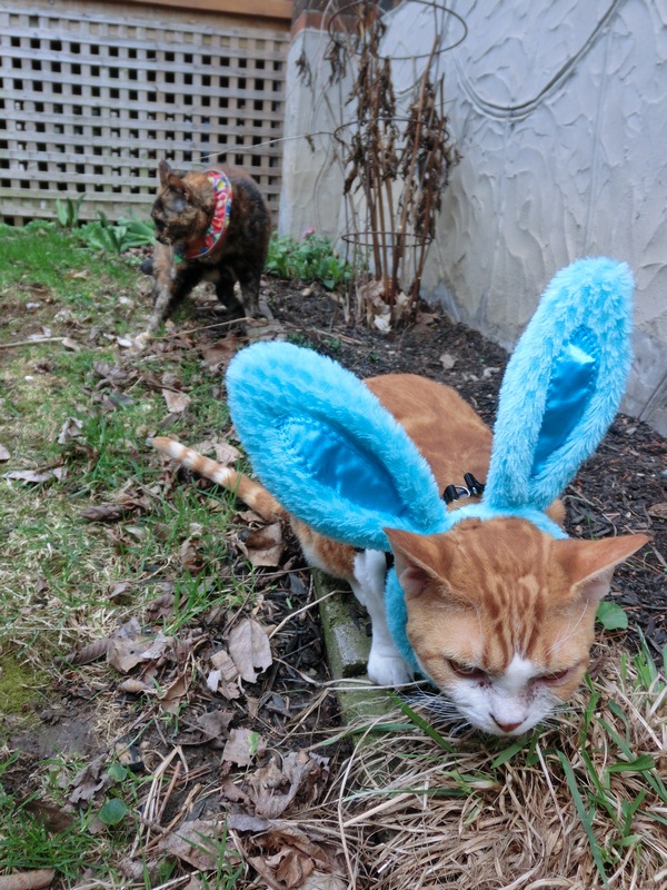 FRODO: Not only has spring arrived and we’re back making visits outside but Mom got us these fantastic bunny ears that I just love wearing! Look at me eating my favorite cat grass — I look just like a real Easter bunny!