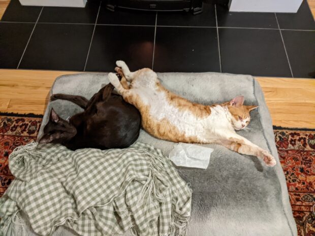 It’s Zulu and Frodo’s fav time of the year. No, not Christmas. Today was the first day mom turned on the fireplace. What we humans know as winter, the felines call “fireplace season”