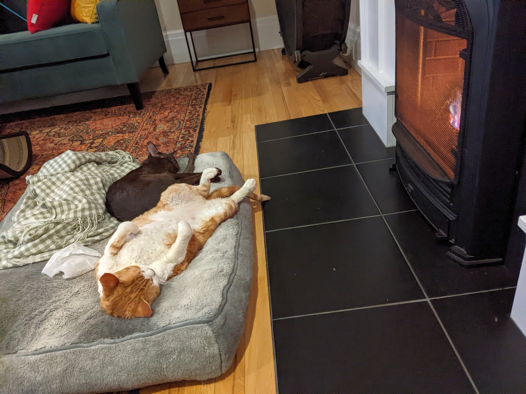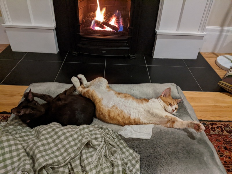 It’s Zulu and Frodo’s fav time of the year. No, not Christmas. Today was the first day mom turned on the fireplace. What we humans know as winter, the felines call “fireplace season”
