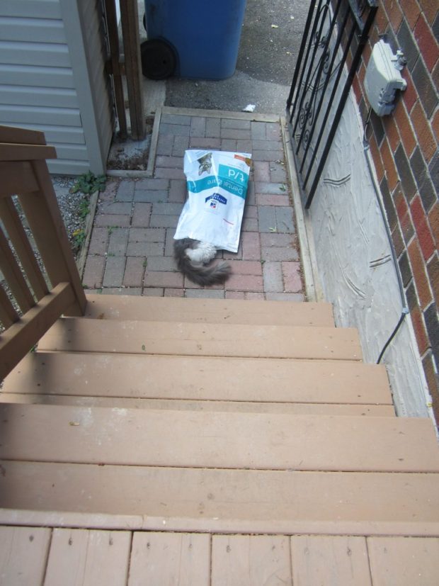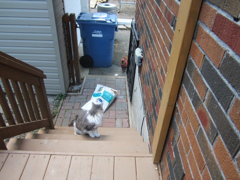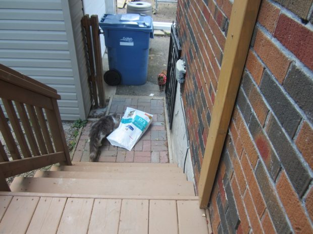 AMARULA: I heard the human throw the cat food bag down the back stairs. I ran because she always lets me lick the bag before she puts it in the trash but what did I see?? That neighborhood menace Play-Doh had the same idea!
