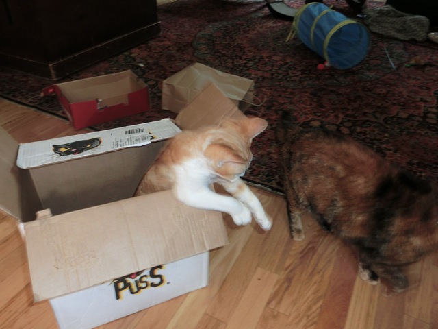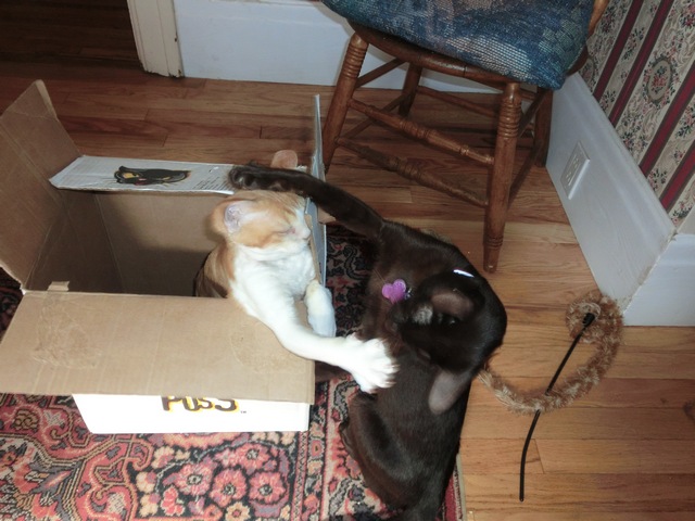AMARULA: Life with Frodo continues to be an incredibly taxing experience. My efforts thus far to frighten him into submission with my superior intelligence, wit and sharp claws seem to have had no effect on the nincompoop, who remains frustratingly cheerful and friendly! Curse that ginger’s gregariousness! But now that imp must be stopped! He has taken to using MY beloved Sour Puss box for his own ends! Though I have clearly said that it is off limits, he continues to sleep, play and just lounge about in it.