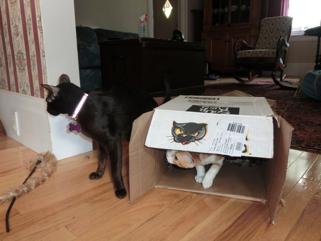 AMARULA: Silence you mocha miscreant! Don’t interrupt! But now Frodo has gone too far! He is using my own box against me! Lately, when I approach my cardboard sanctuary innocently planning to catch an eight-hour nap…