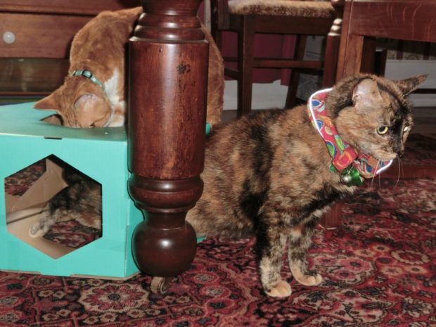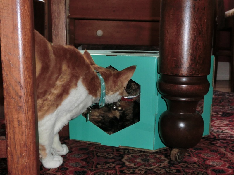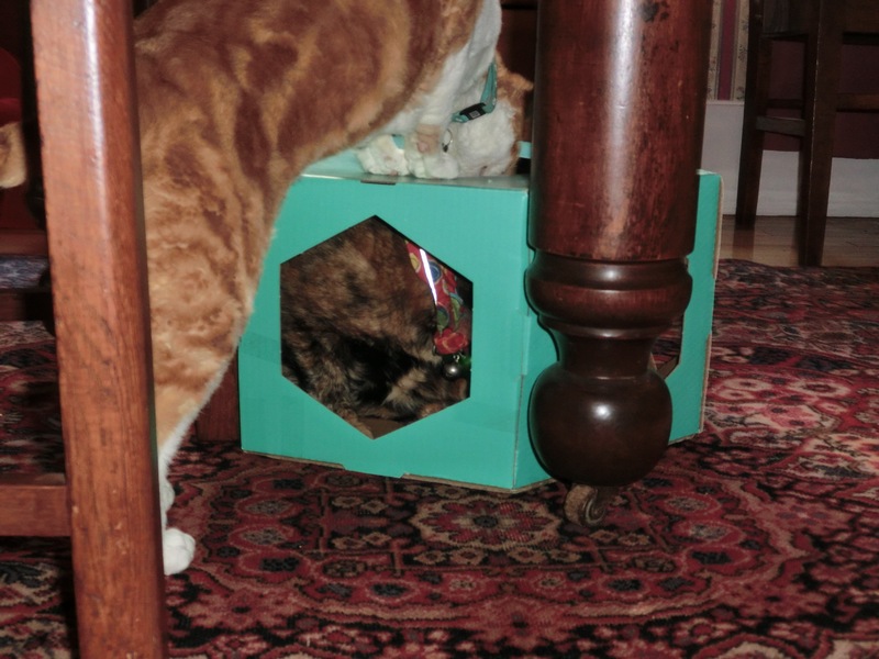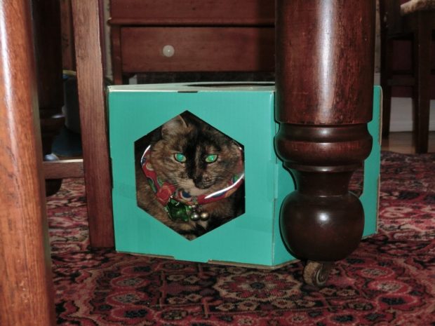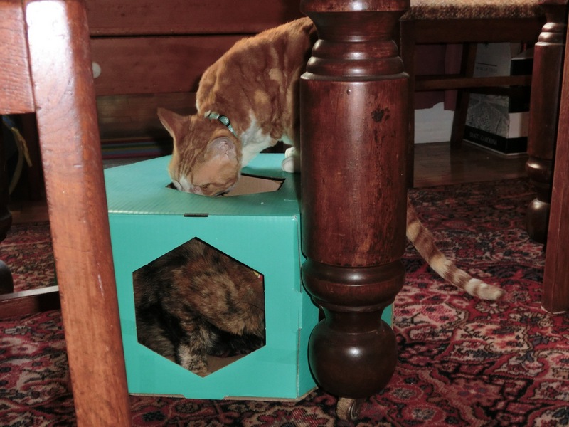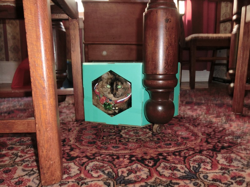 Sadly we have that happen at my house all the time. Maybe it’s a bag or a box…or a just-dried basket of clean laundry…and here come Opie or Frank or Peaches to take it from me. I’ve had some spectacular boxes (nothing as pawsome as your Hexagon,though) but in the end, my secret hideaway is soon discovered…and fouled with the stench of my brothers. *Sigh*