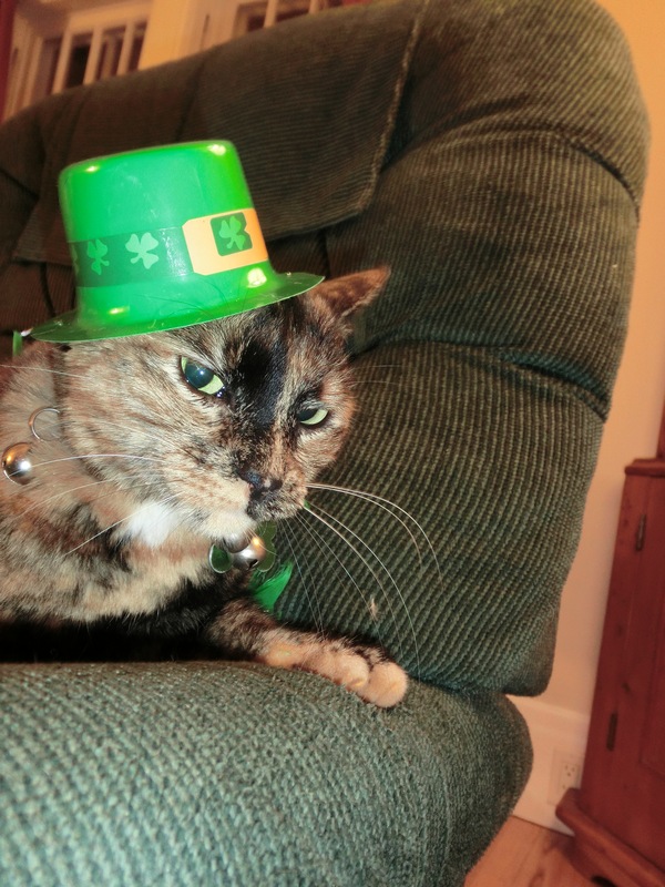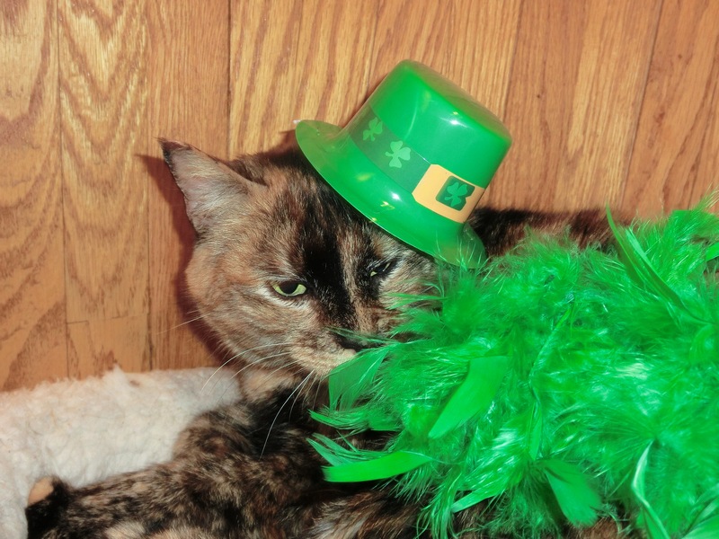 The Human’s cruelty knows no bounds. Granted, green shows off my emerald eyes to perfection, but still, there are limits! I was almost going to let her live until she added the feathers. Now I am just deciding whether I should wait to kill her until after she feeds me. Murder and mayhem can be so tiring on an empty stomach!