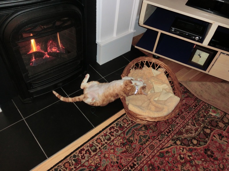 Oh if I had one of those toasty fireplaces I would go bottoms up, too, just like Frodo! He is one lucky kitty! Tummy tickles!