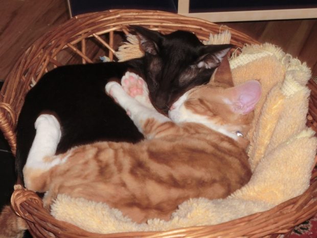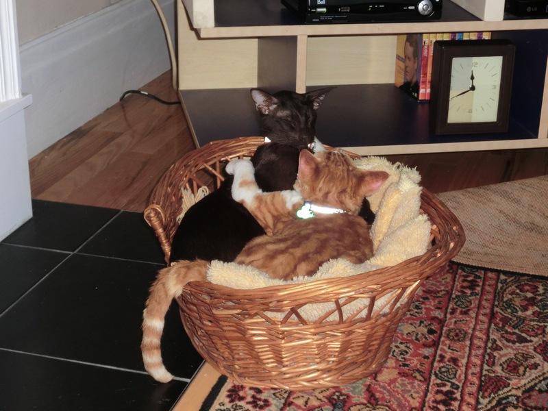Squee! So cute. These two are adorable together. It looks like your basket has new ownership. 🙂 I love to see cats cuddle together!