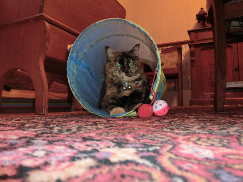 The tunnel looks like a great place to hide – but why do you have bells at your collar? Not good for hiding.
