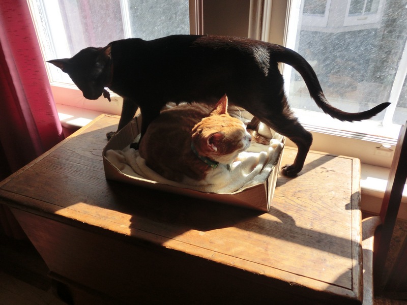 I don’t think I’ve ever used the word “darling” … but if anything is, it’s that sweet last picture of Zulu and Frodo. Bear’s not a box cat either … maybe when he and Ellie snuggle (oops … IF), he’ll change?!?! Over the weekend, we watched The Lord of The Rings trilogy and I thoroughly irritated The Boy by telling him all about your Frodo … and Zulu and Amarula (saving the best for last!!!). Any time I hear the name Frodo, your ginger menace (as Amarula would call him) comes to mind … that’s branding!!! 🙂